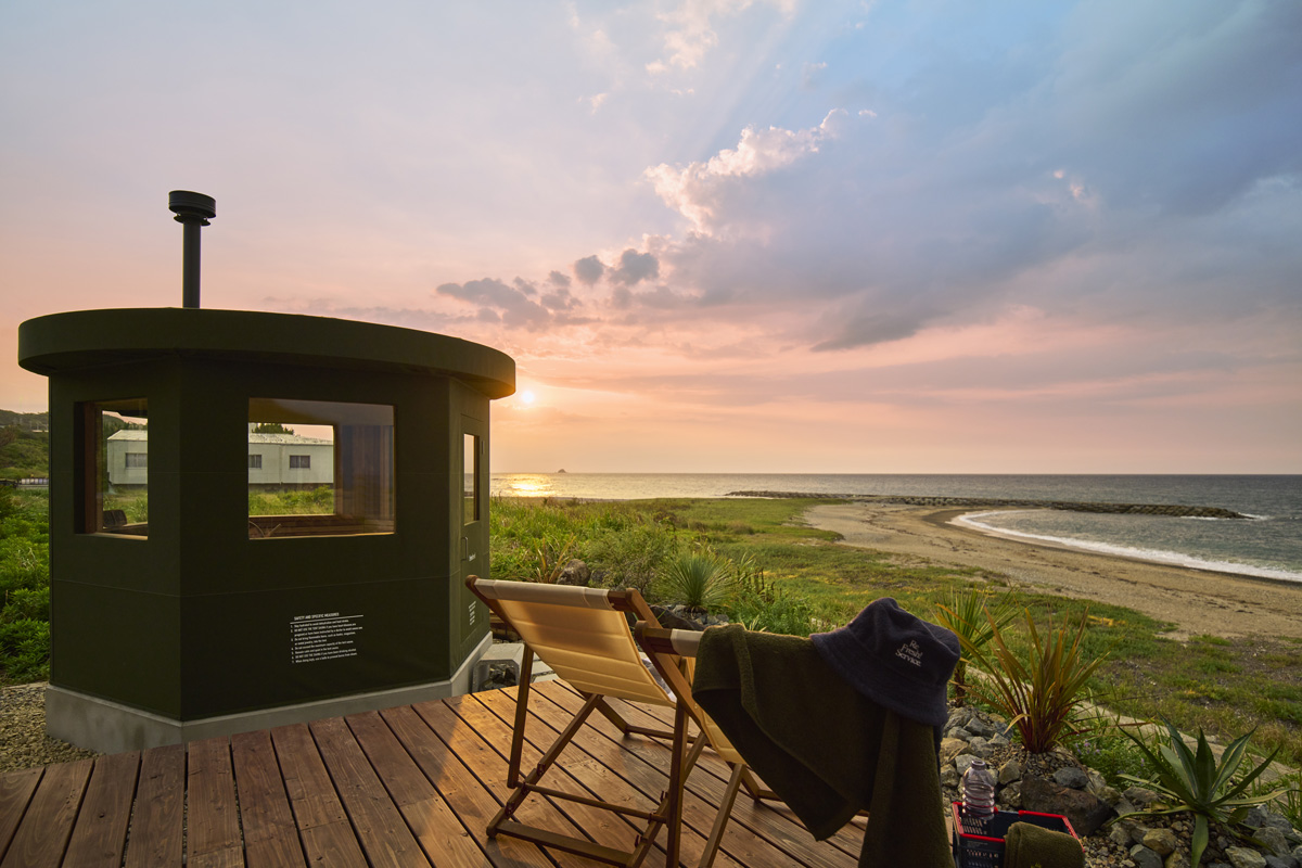 でも、ただのサウナ小屋じゃつまらない。『FreshService』らしい「アーミー(軍モノ)」のエッセンスを取り入れ、リファレンスにしたのはなんと「監視塔(ウォッチタワー)」です。六角柱の無骨なフォルムに、機能を凝縮したテントサウナは、デジタル空間を飛び出し、海辺に実棟も出来上がりました。