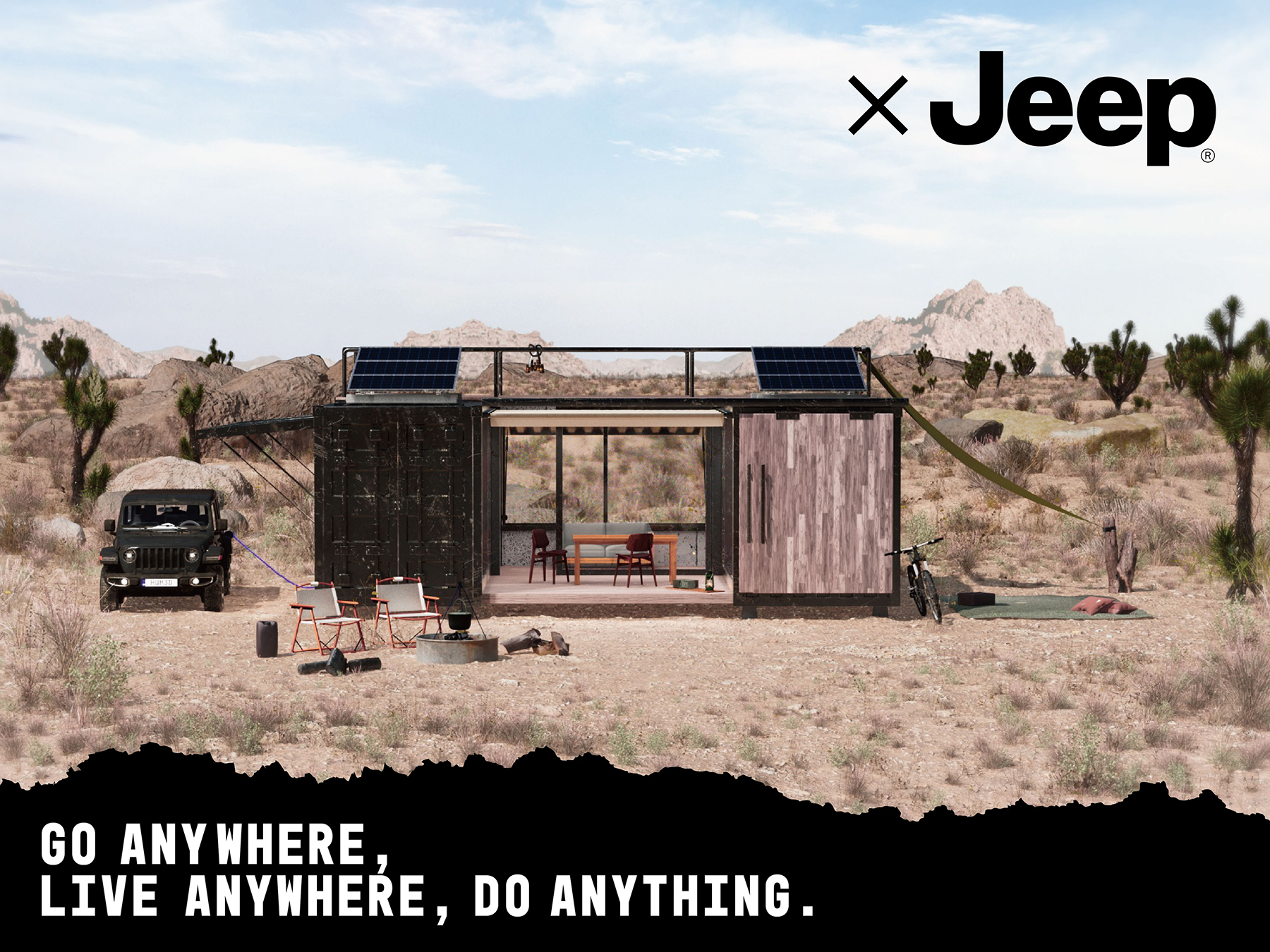 圧倒的な走破性で冒険心を駆り立てる『Jeep』。そのスピリットである「Go Anywhere, Do Anything.」をコンセプトにデジタルハウスをつくったのが、「旅する家」です。どこへでも走っていけるクルマのように、どこへでも連れていける家があったらどうだろう。そんな発想から、移動を前提としたコンテナハウスが生まれました。