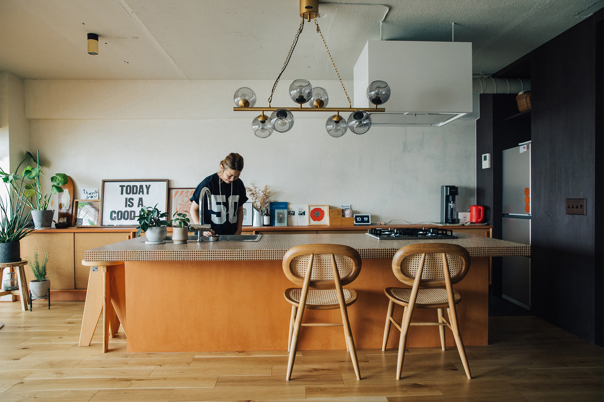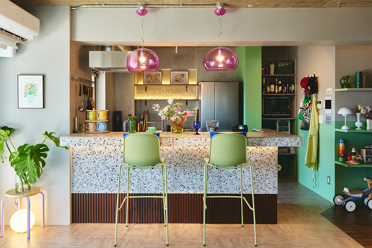 最後にご紹介するのは、海外のホテルのような空気感を持つこの空間。主役は、大理石の粒を散りばめたような「テラゾータイル」のカウンターです。そこにクリアピンクのガラス照明を。普段の家ではなかなか出会わない組み合わせなのに、このキッチンでは自然に溶け合って、ちょっとしたバーのようなムードをつくっています。