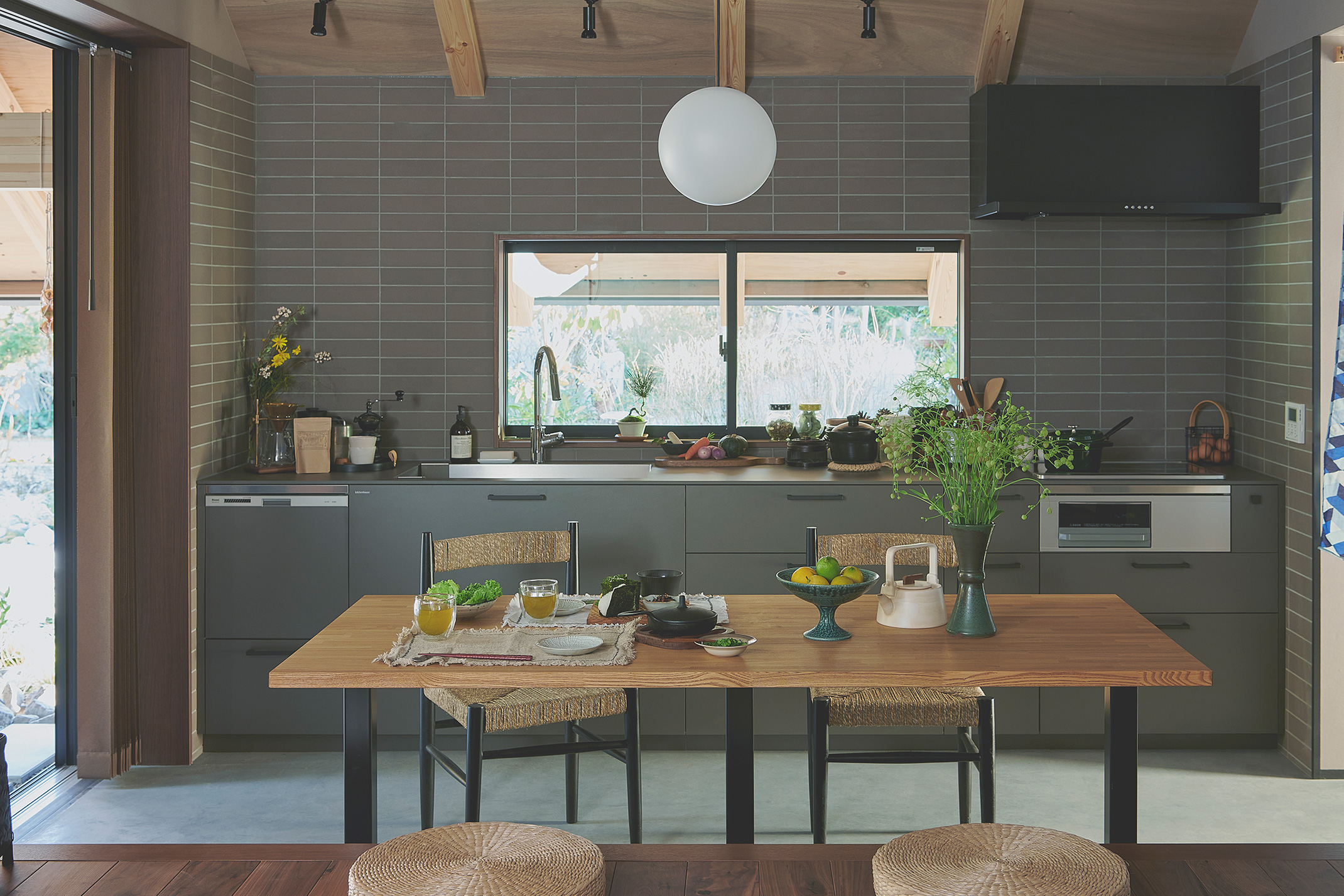 土間とつながる開放感。グレータイルで引き締めた和モダンキッチン