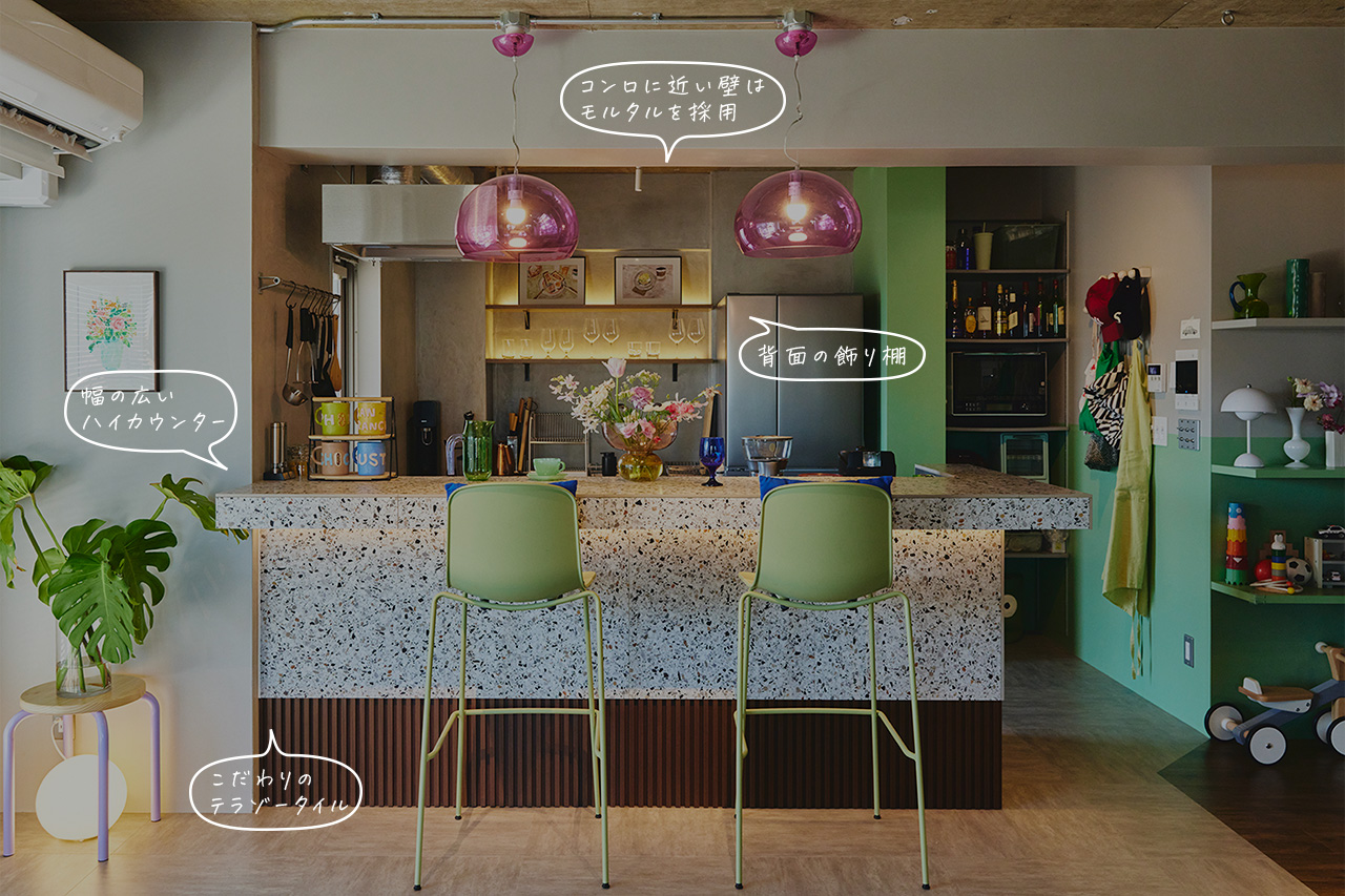 コンロ周りの壁はモルタルで無機質に仕上げつつ、背面の飾り棚にはお気に入りのアートやグラスをディスプレイ。「キッチン=家事」という概念を捨て、好きなモノに囲まれて心を満たす。そんな豊かな時間の使い方が似合う、感性あふれるデザインです。