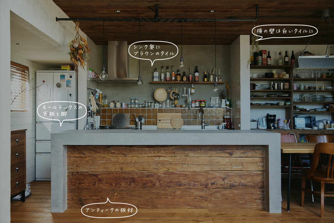 100年の時を刻むキッチンカウンター。「アンティーク×モールテックス」の異素材ミックス
