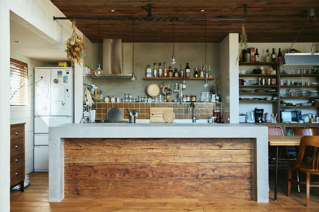 まるで隠れ家のビストロのような佇まいのキッチン。その主役は、100年モノのアンティーク板材を腰壁に張ったキッチンカウンターです。ただ古いだけではありません。天板にはモルタル調のモールテックスを組み合わせることで、古材の渋みを現代的に引き締めています。