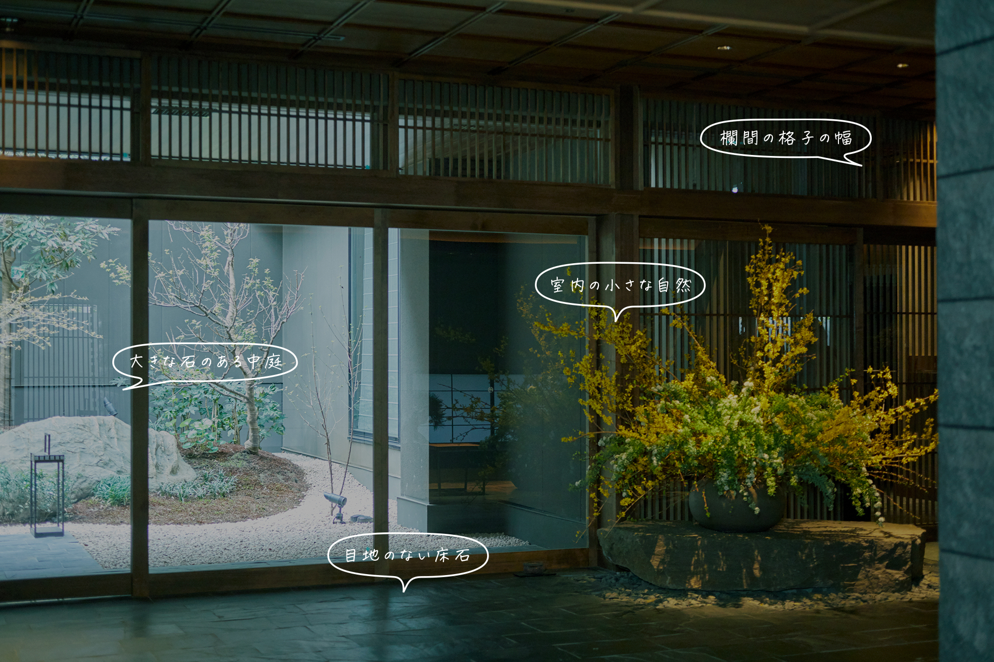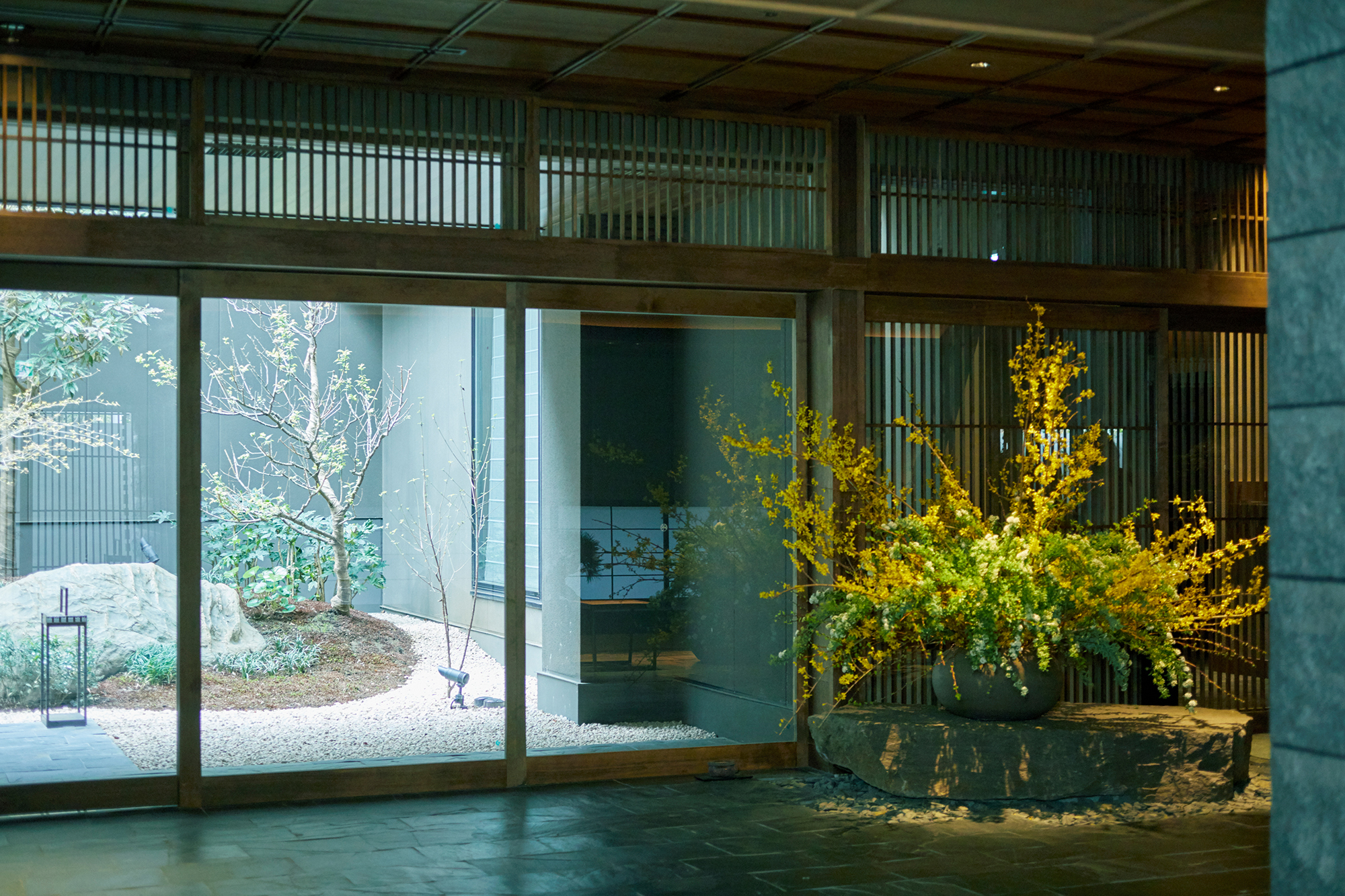 世田谷代田にある温泉旅館「由縁別邸 代田」。伝統的な欄間の格子の幅をあえて15mmと細くしてモダンに見せる工夫や、目地のない滑らかな床石、室内の「小さな自然」の配置など、細部にまで美学が宿っています。伝統的な意匠を現代風にどう「翻訳」して取り入れるか、さまざまなアイデアがここにつまっています。