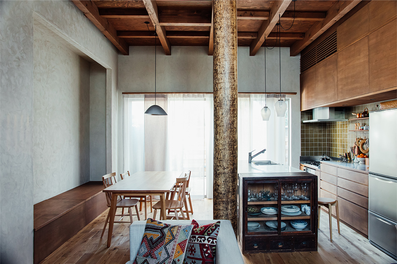 編集者の徳さんが目指したのは、人が自然と集まるようなリビング。空間をゆるやかに仕切る吉野檜の大黒柱(錆丸太)を主役に、温かみのあるナラ材の床、そしてDIYで仕上げたシリカライムの壁が、実家の居間のような安心感を生んでいます。収納付きの長いベンチを「床の間」感覚で使うなど、現代の板間リビングに和の落ち着きを添えるアイデアが光ります。